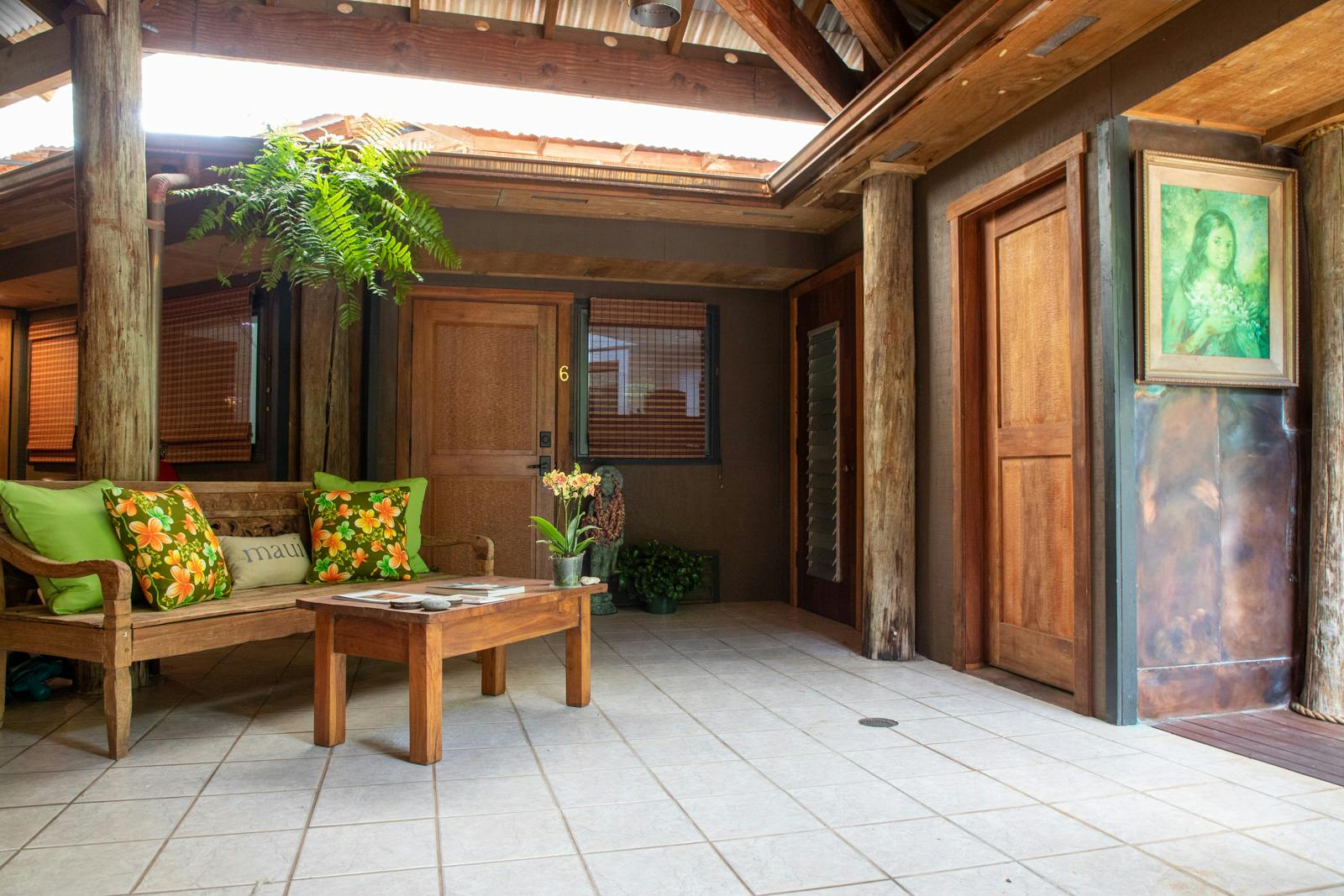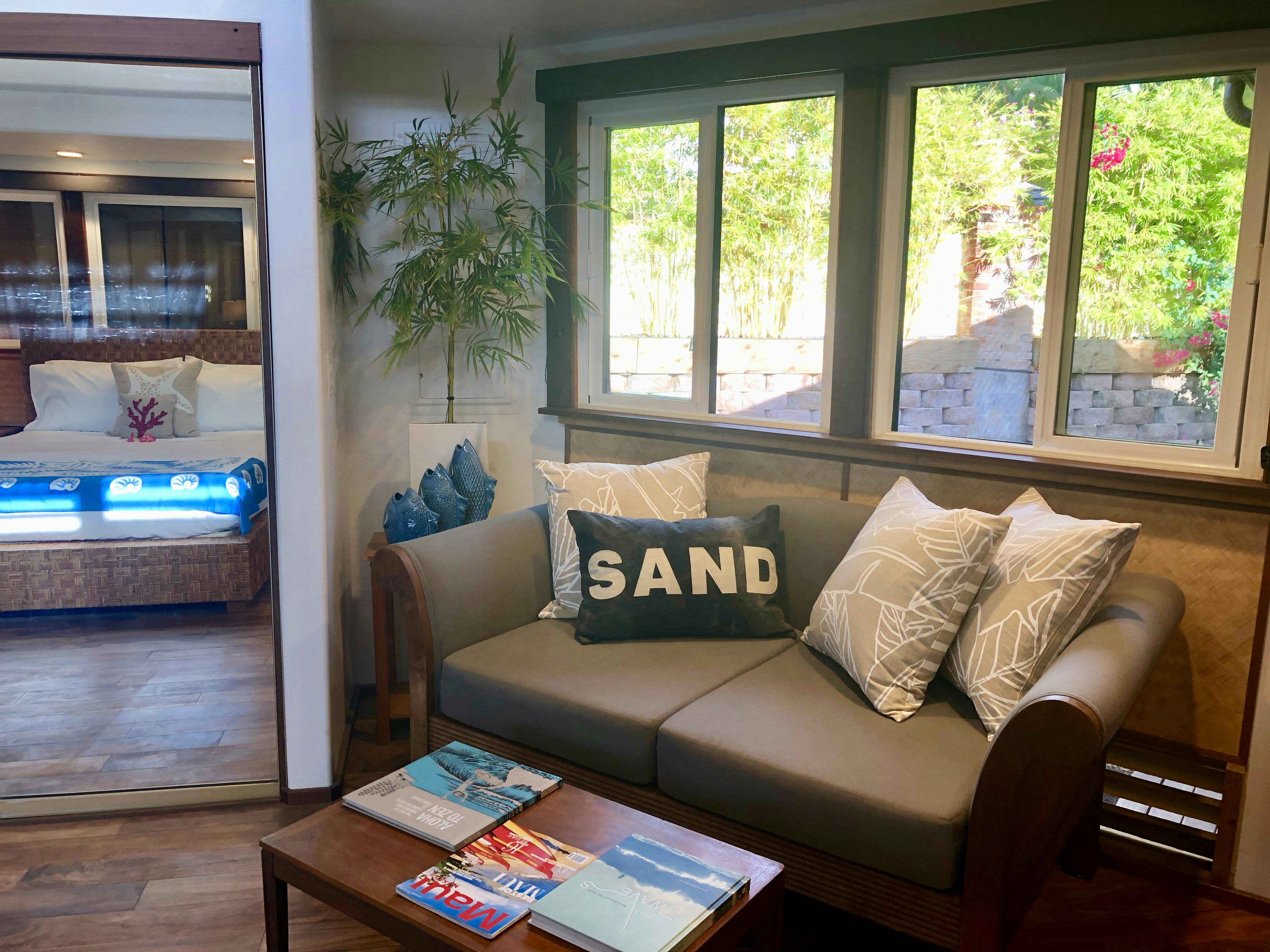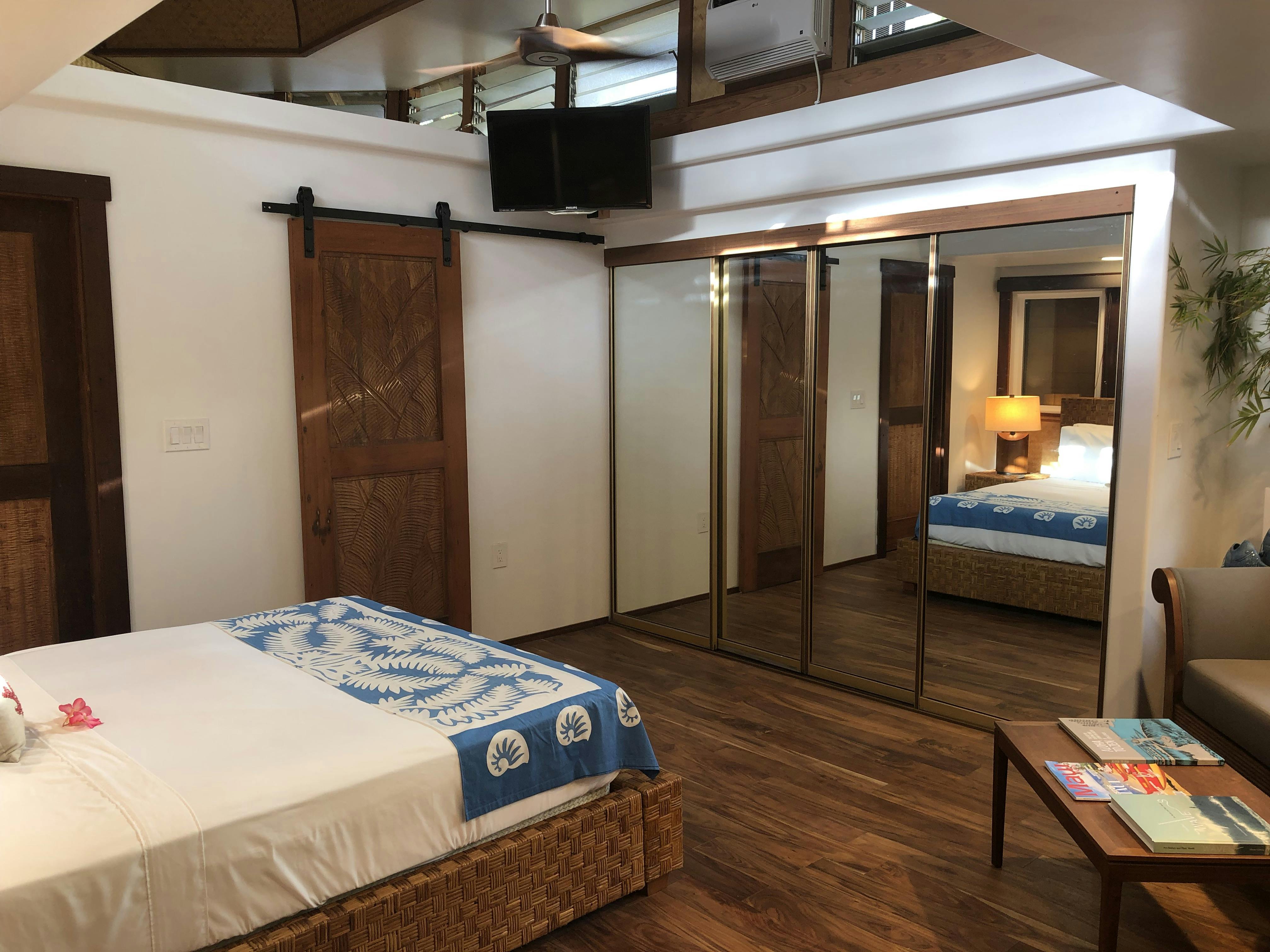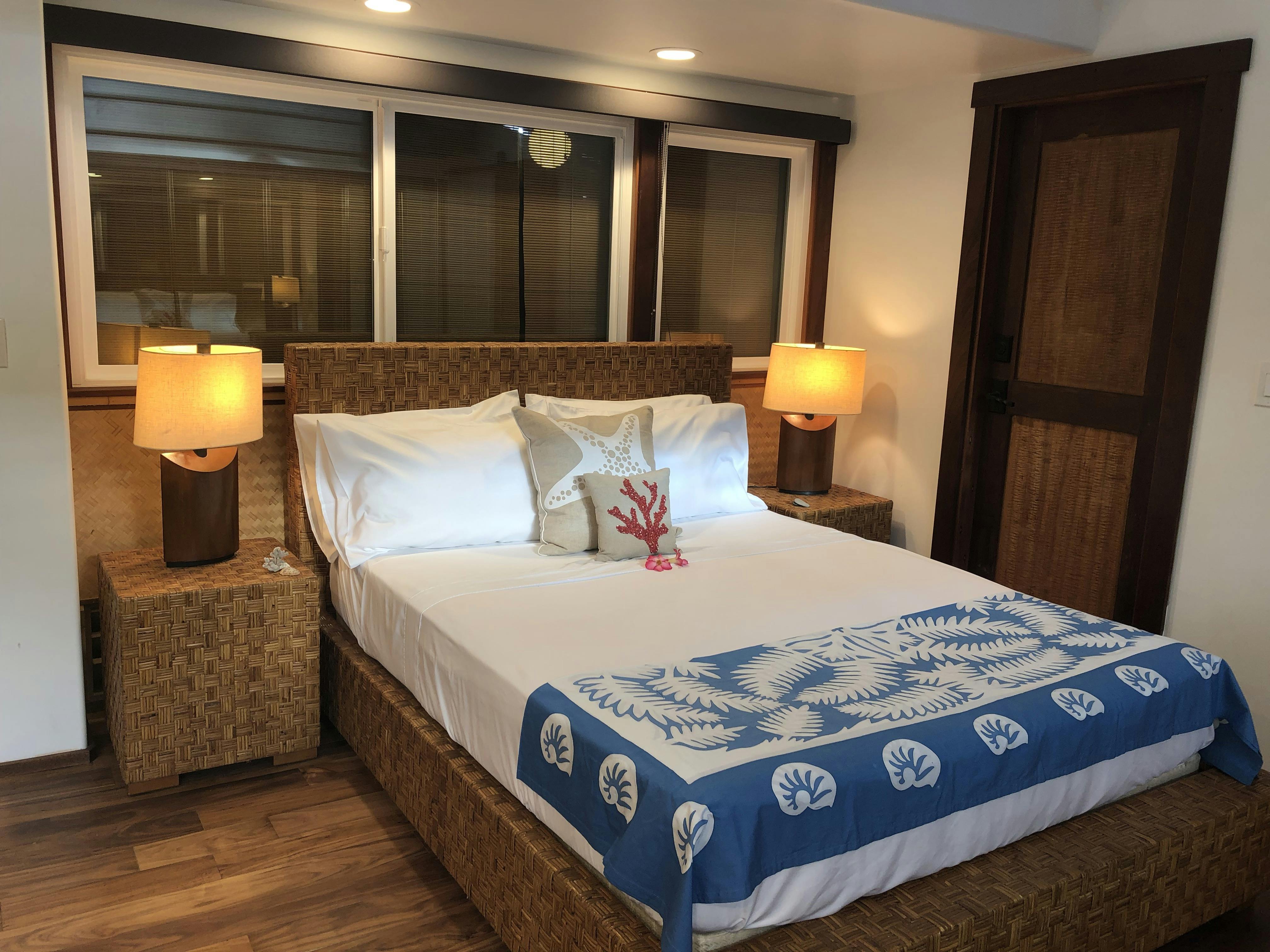 We've tried to incorporate as many natural materials in our bungalows as possible--tropical hardwood floors and carved doors, hand poured concrete counters, fresh foliage, etc. Our high barrel ceilings have louvered windows for natural ventilation, though bedrooms are equipped with A/C units. We've furnished the units with vintage Hawaiiana details, but we've kept things basic and hope you will enjoy a more simple way of living during your stay.