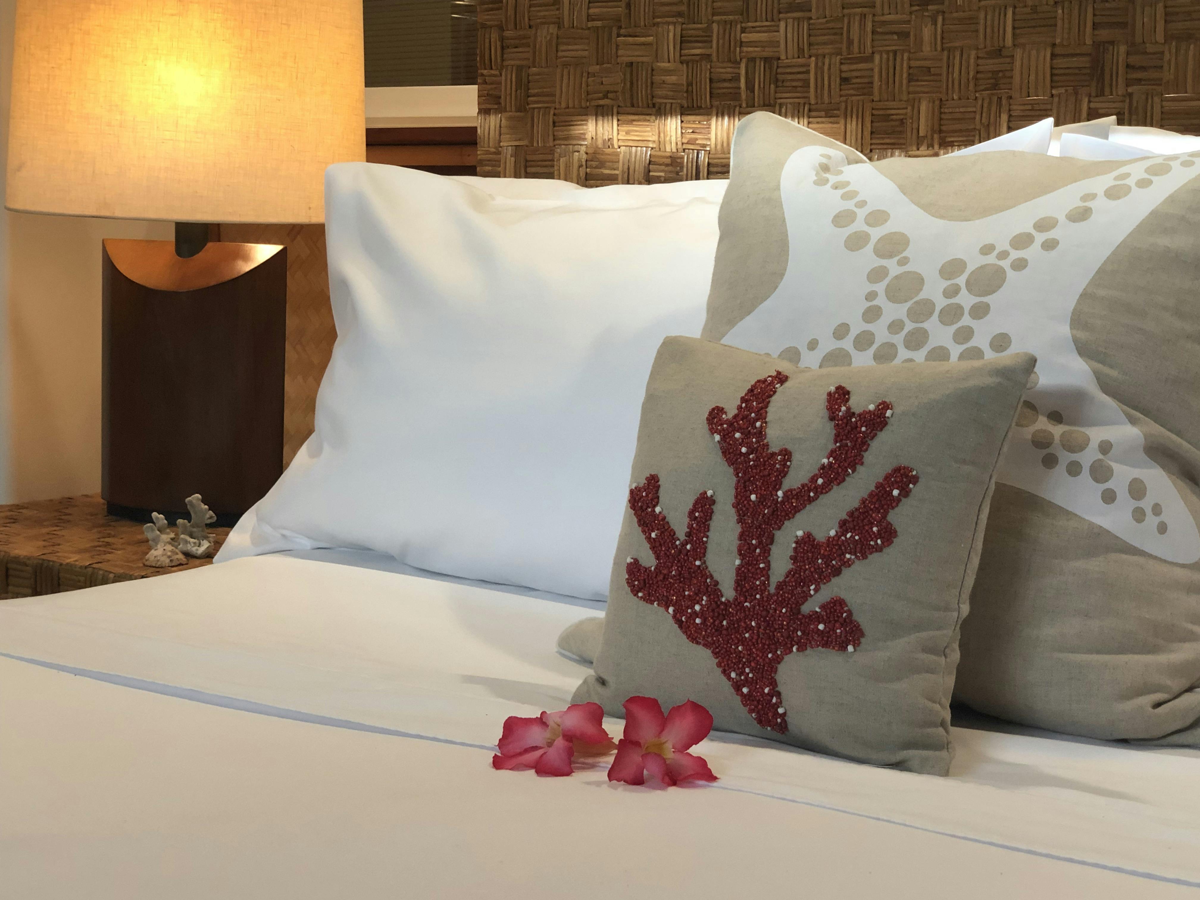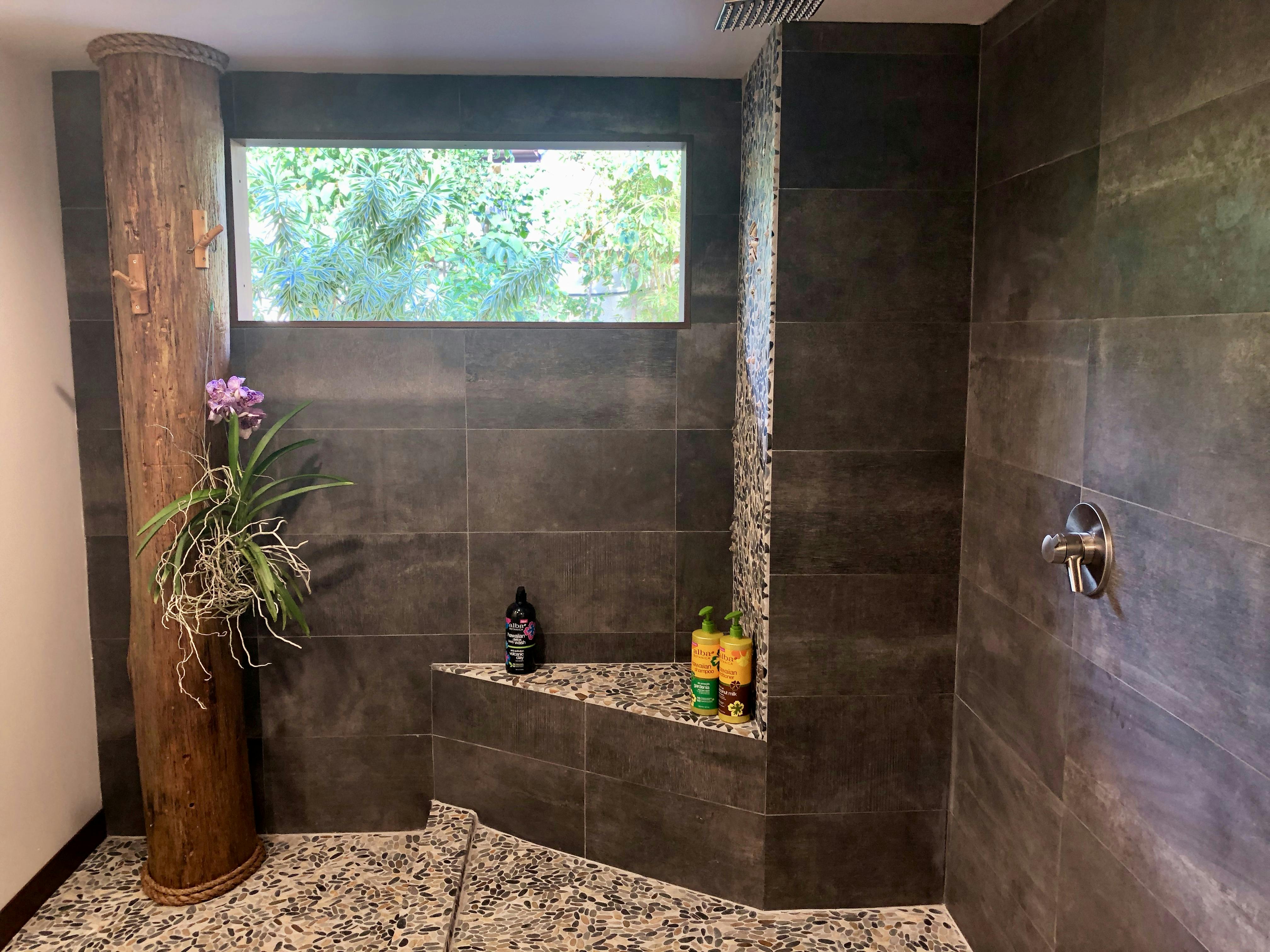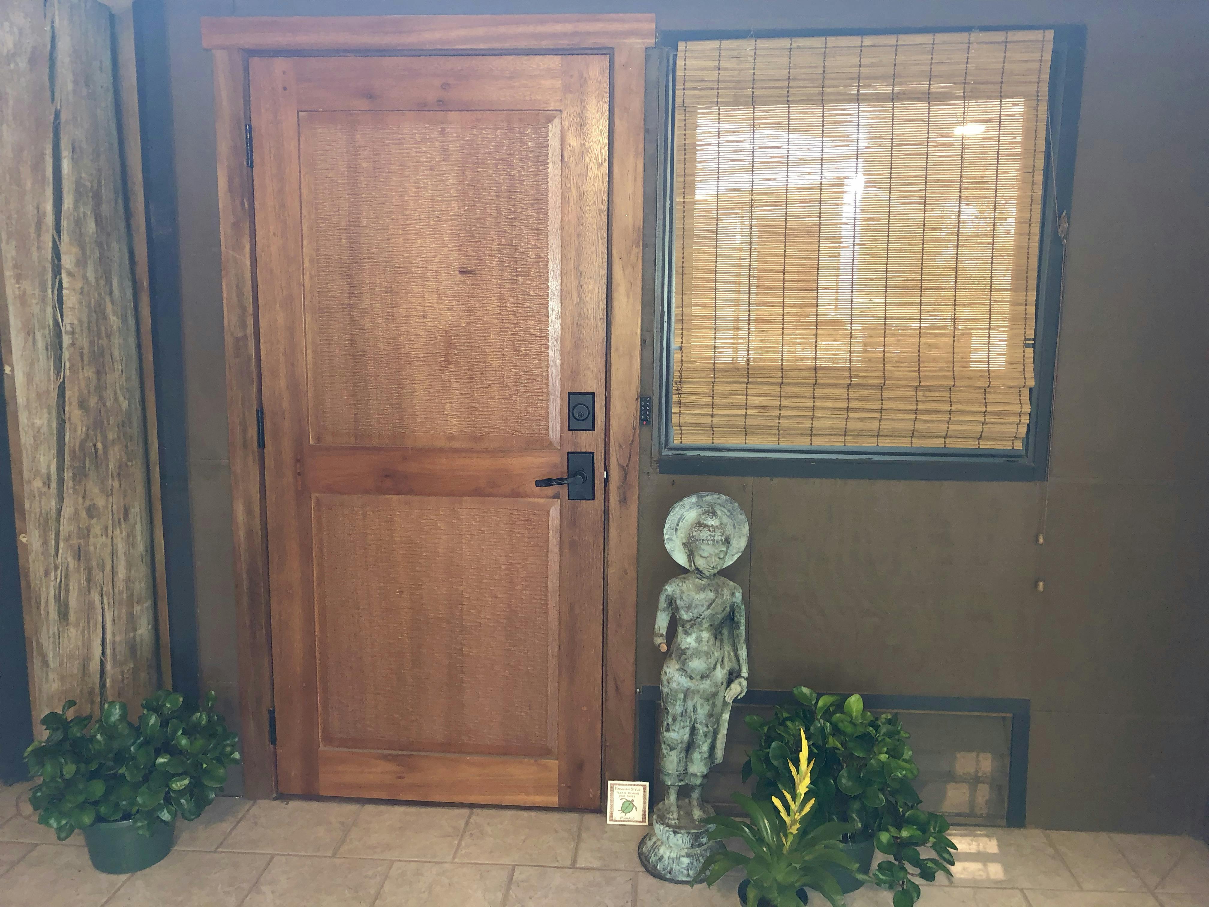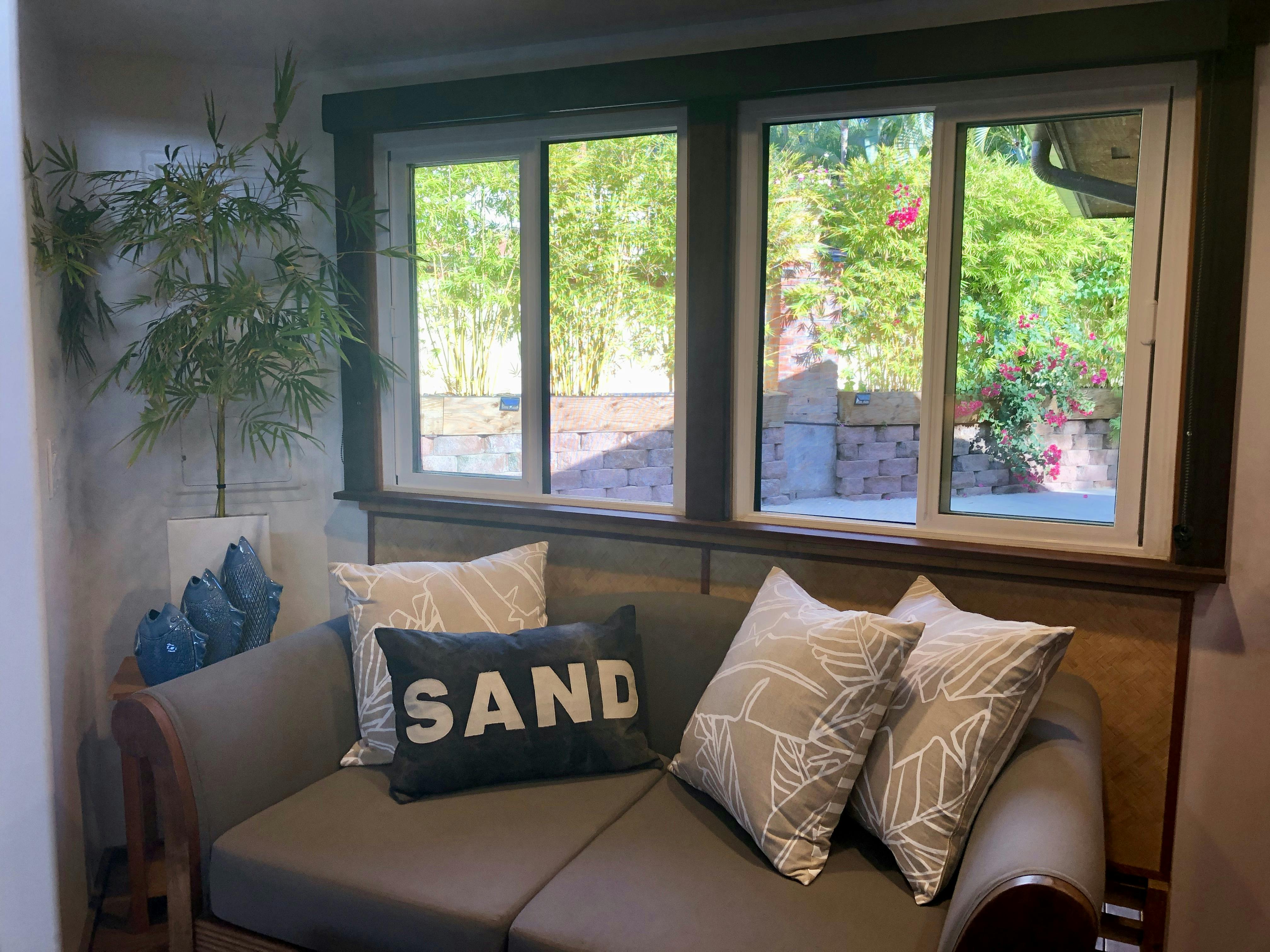 We've tried to incorporate as many natural materials in our bungalows as possible--tropical hardwood floors and carved doors, hand poured concrete counters, fresh foliage, etc. Our high barrel ceilings have louvered windows for natural ventilation, though bedrooms are equipped with A/C units. We've furnished the units with vintage Hawaiiana details, but we've kept things basic and hope you will enjoy a more simple way of living during your stay.