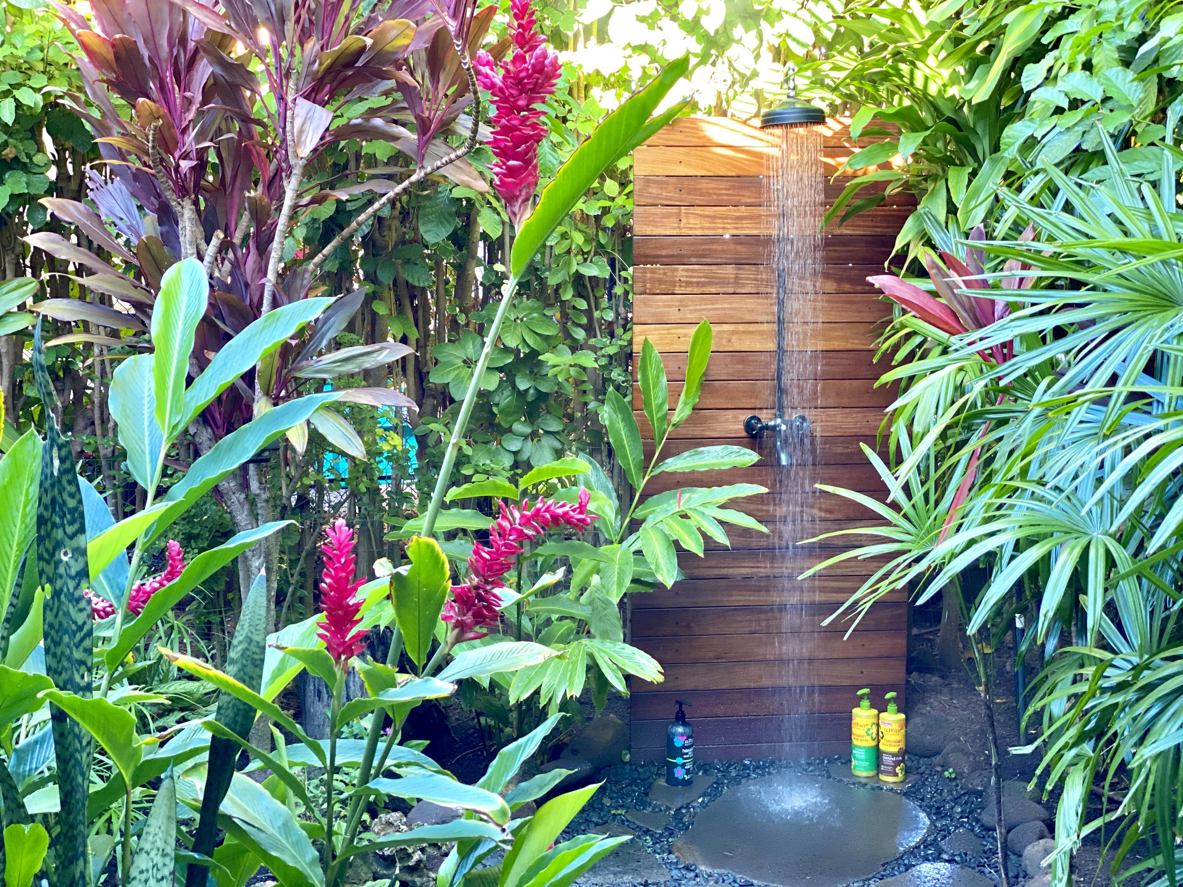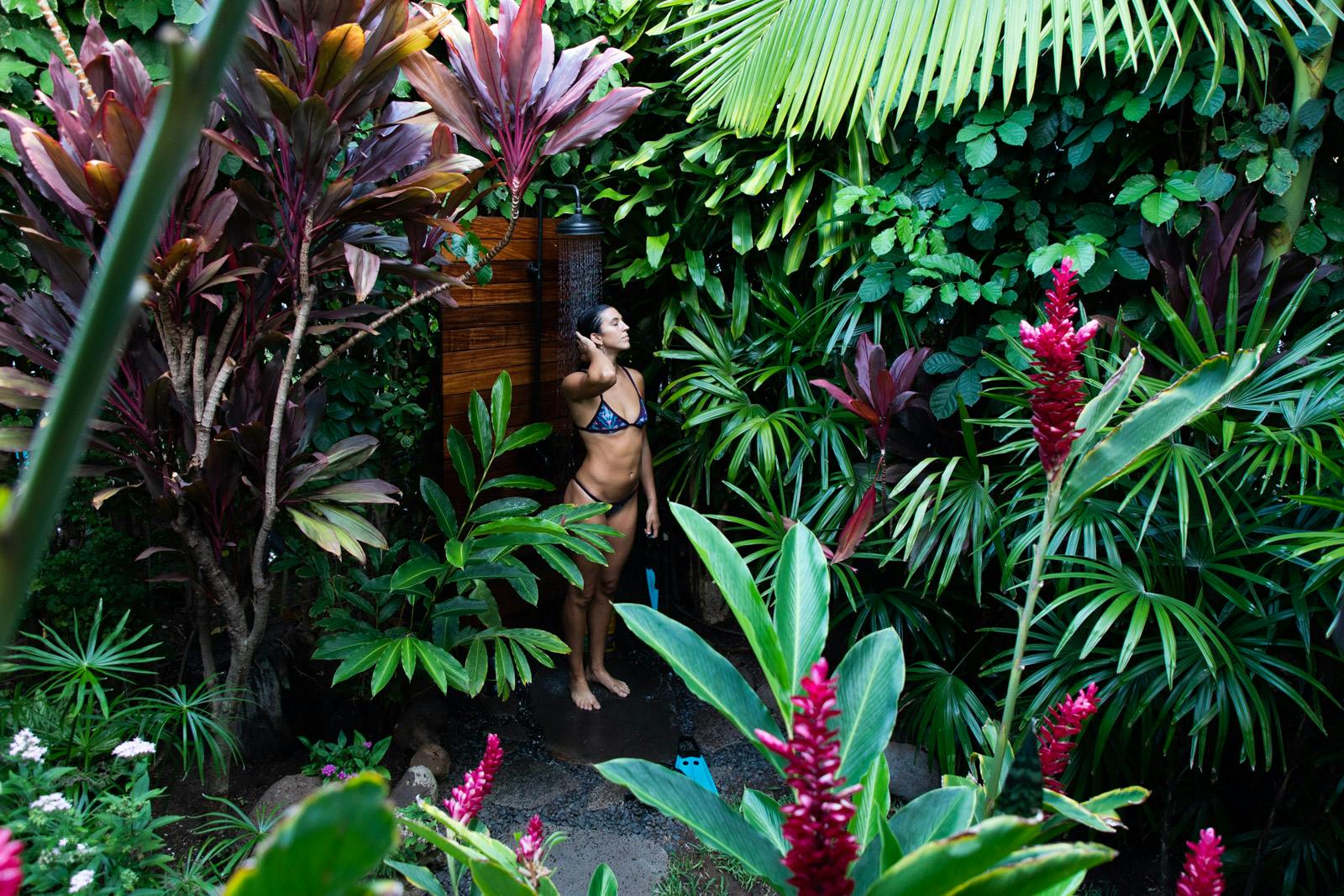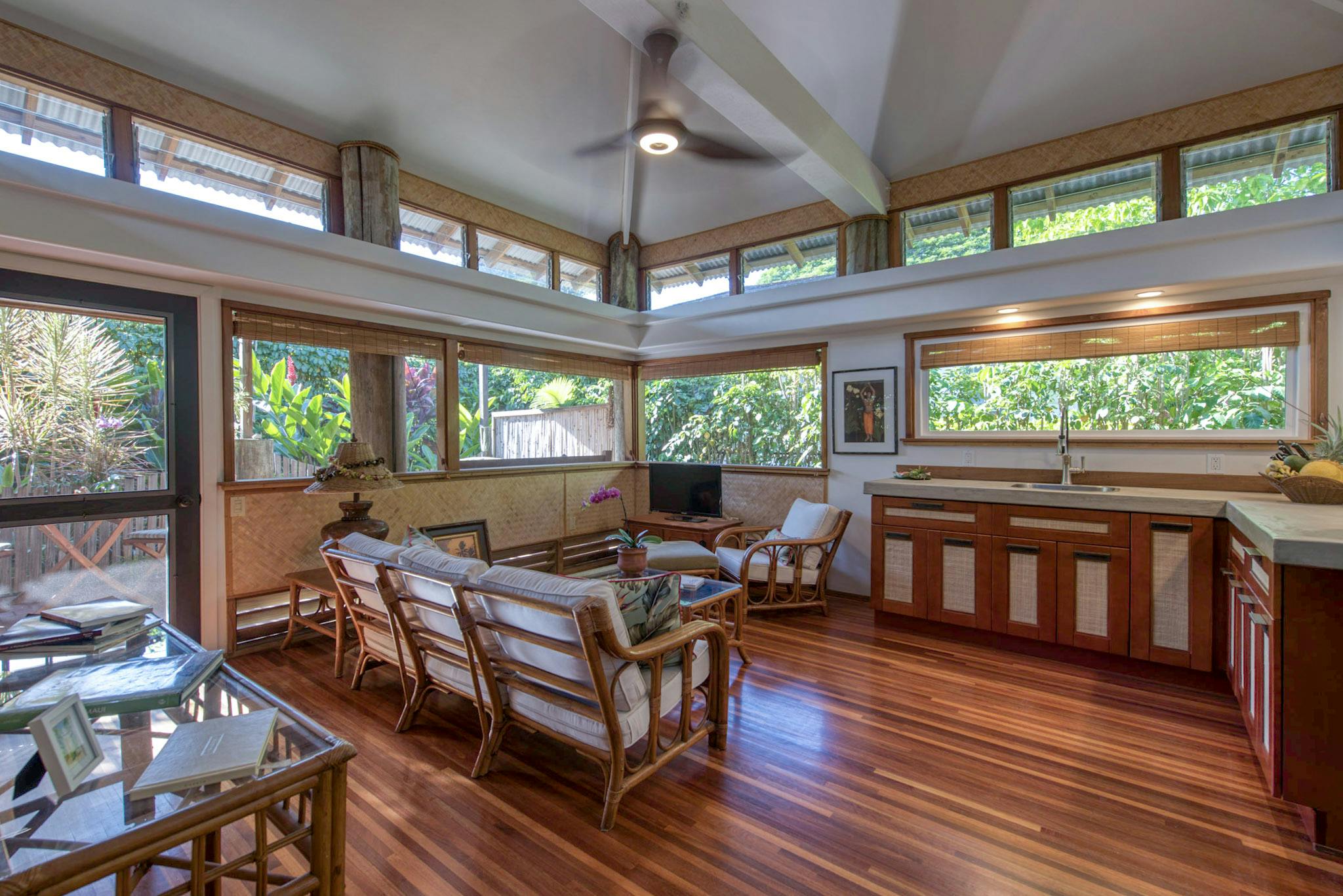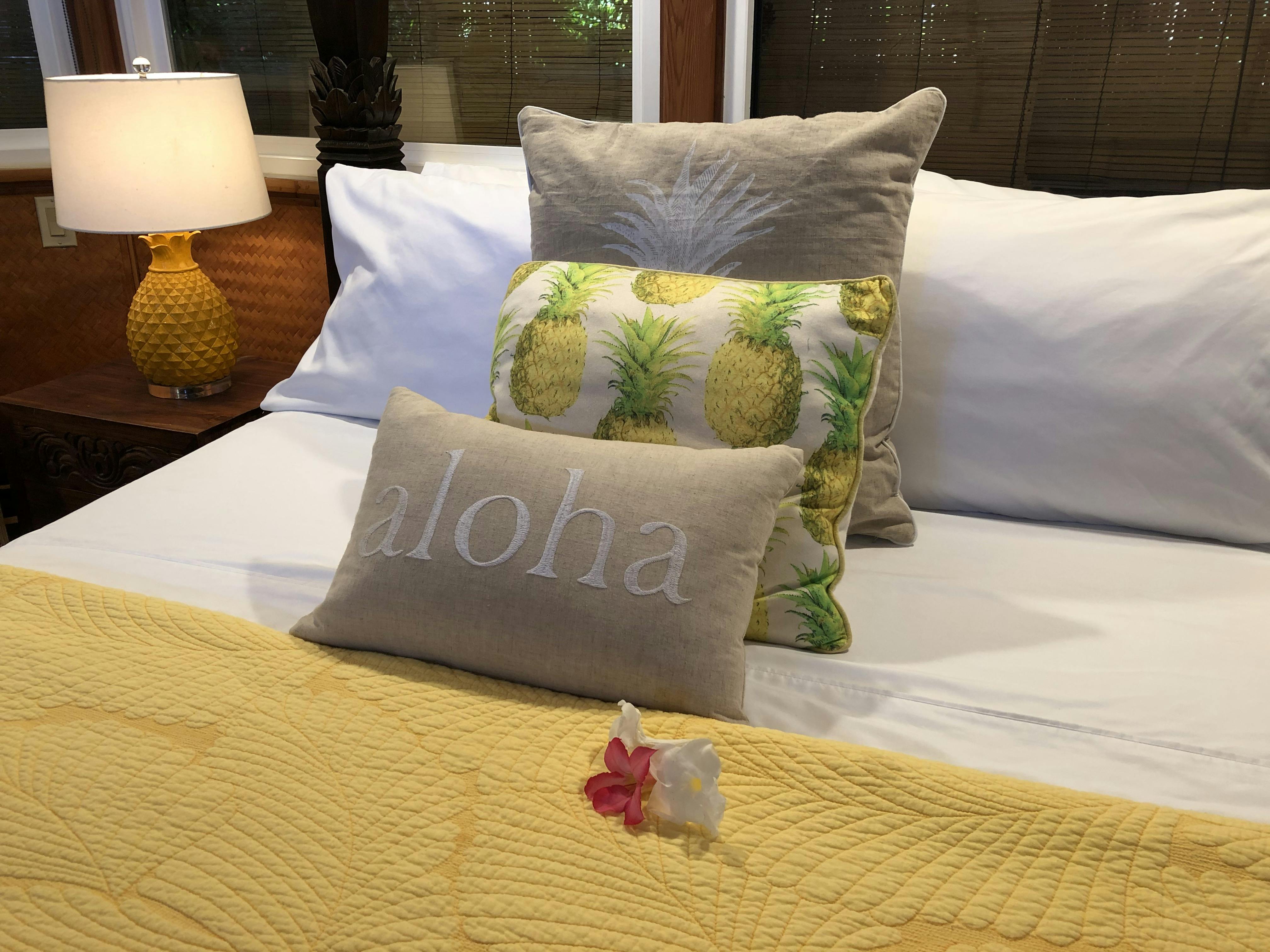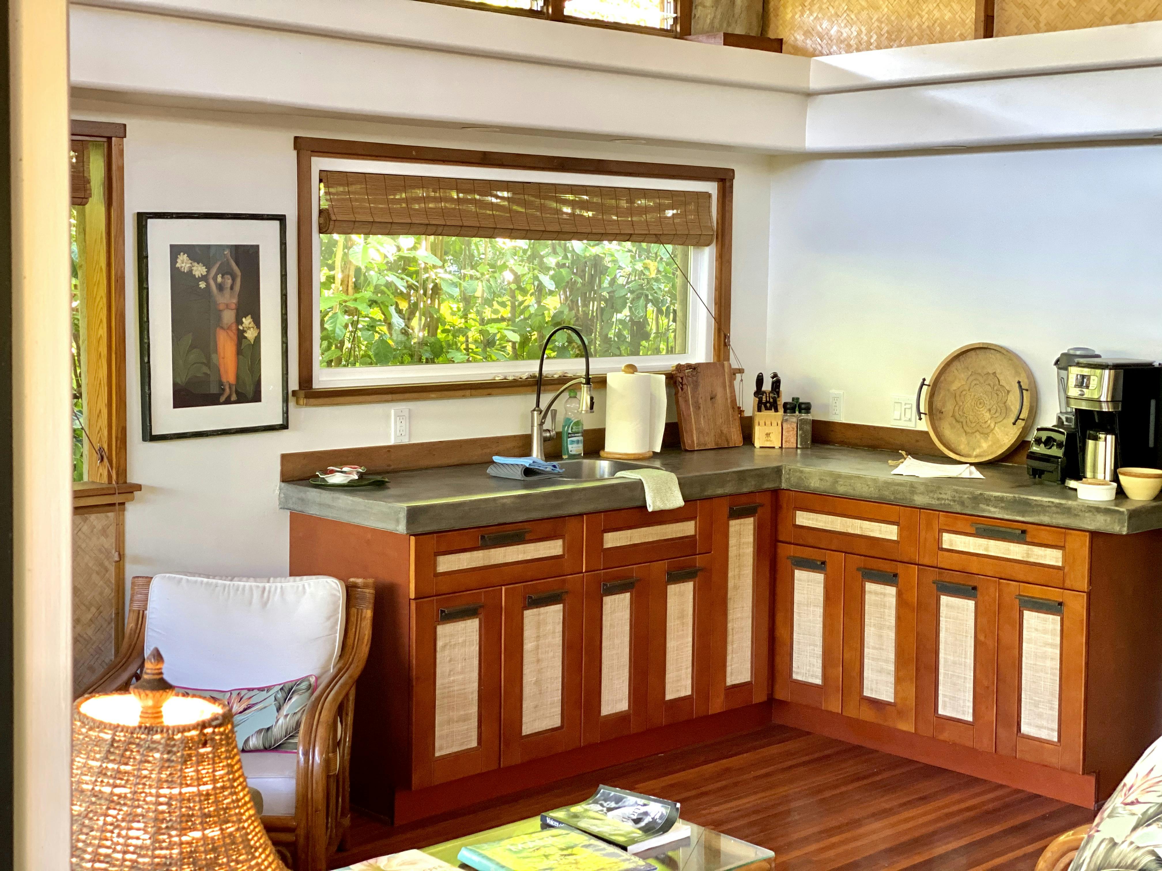 We've tried to incorporate as many natural materials in our bungalows as possible--tropical hardwood floors and carved doors, hand poured concrete counters, fresh foliage, etc. Our high barrel ceilings have louvered windows for natural ventilation, though bedrooms are equipped with A/C units. We've furnished the units with vintage Hawaiiana details, but we've kept things basic and hope you will enjoy a more simple way of living during your stay.