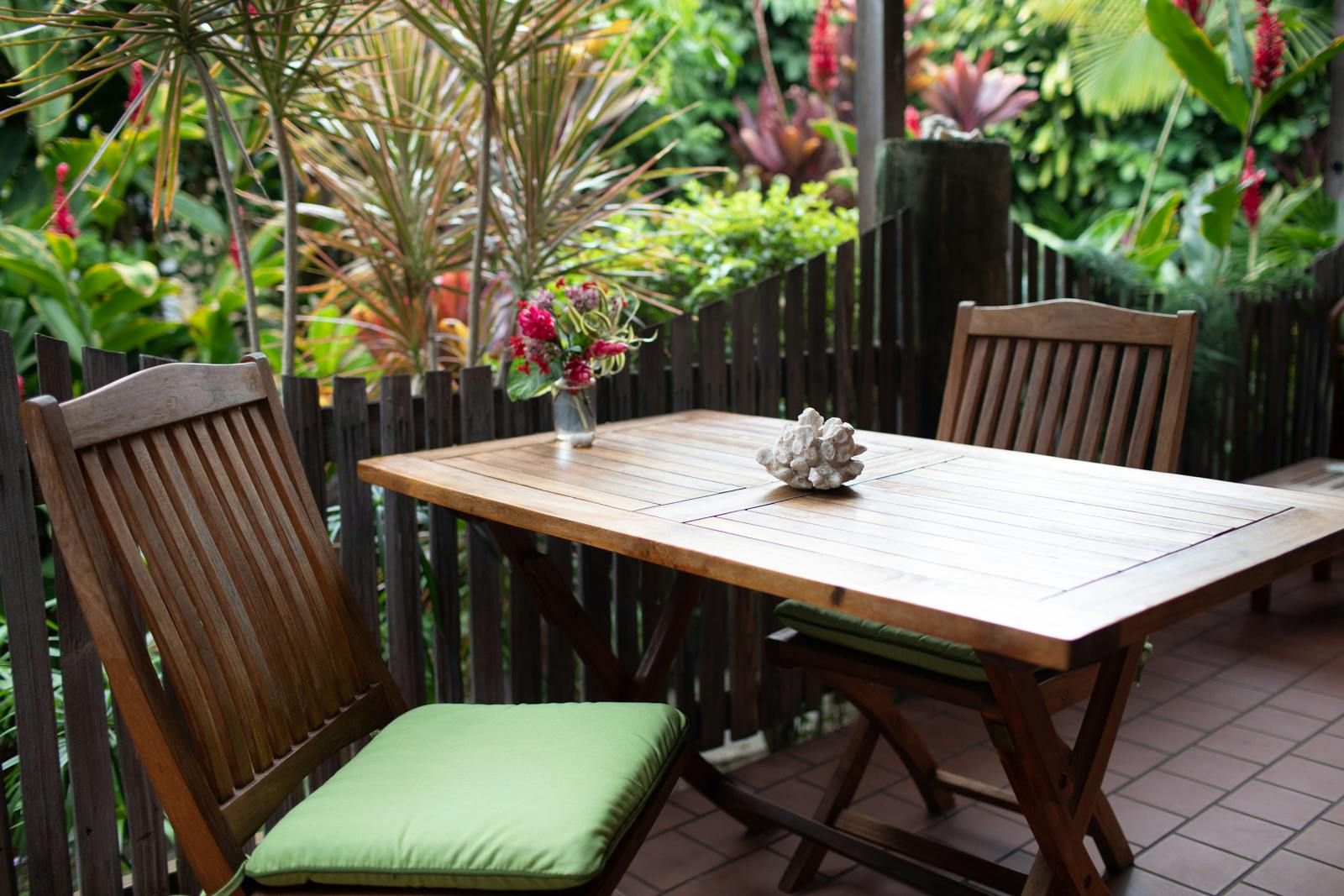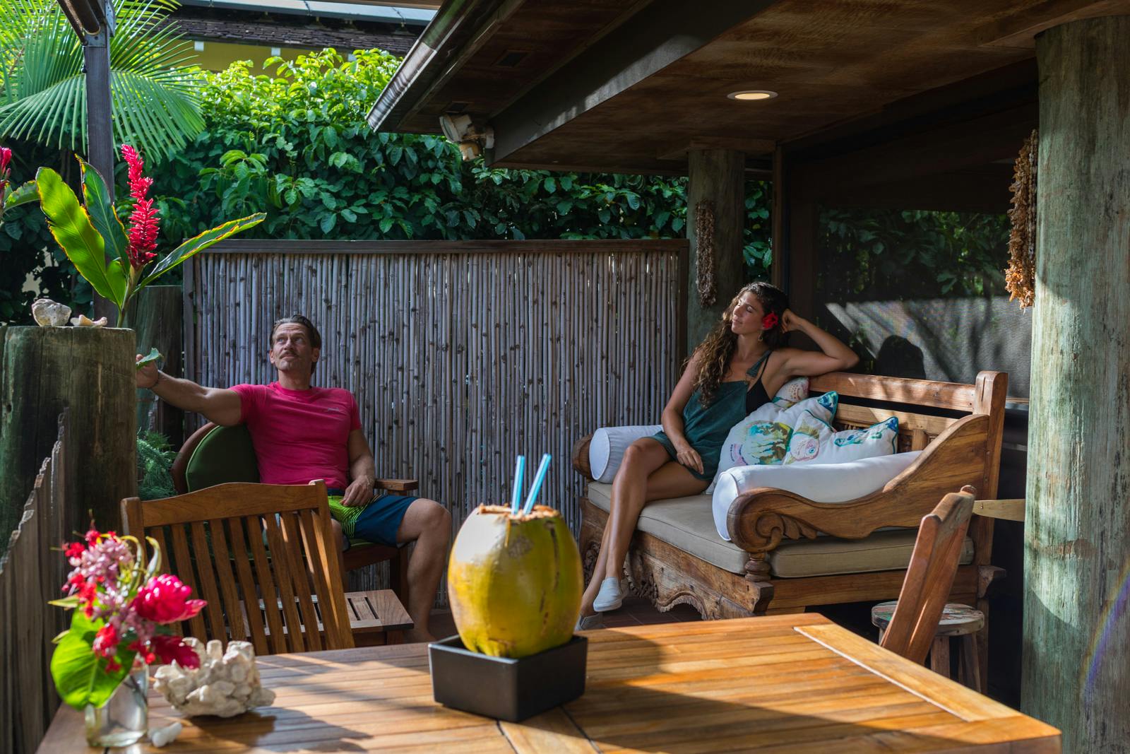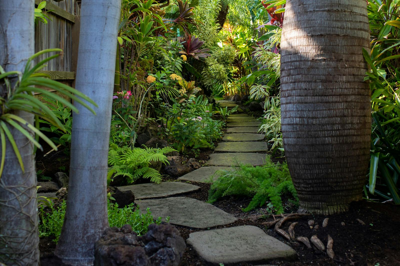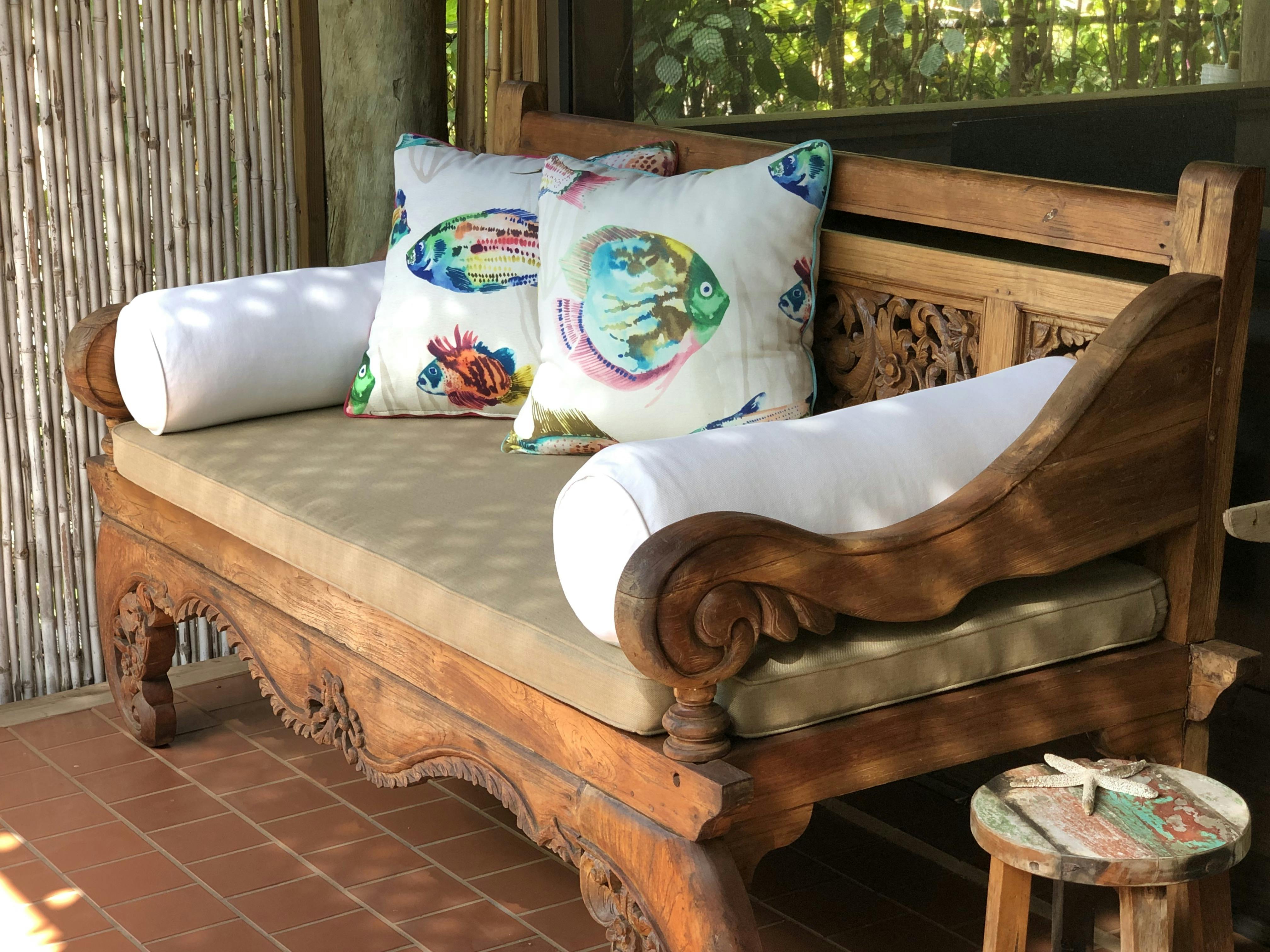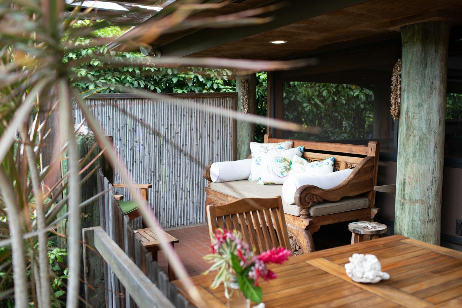 We've tried to incorporate as many natural materials in our bungalows as possible--tropical hardwood floors and carved doors, hand poured concrete counters, fresh foliage, etc. Our high barrel ceilings have louvered windows for natural ventilation, though bedrooms are equipped with A/C units. We've furnished the units with vintage Hawaiiana details, but we've kept things basic and hope you will enjoy a more simple way of living during your stay.