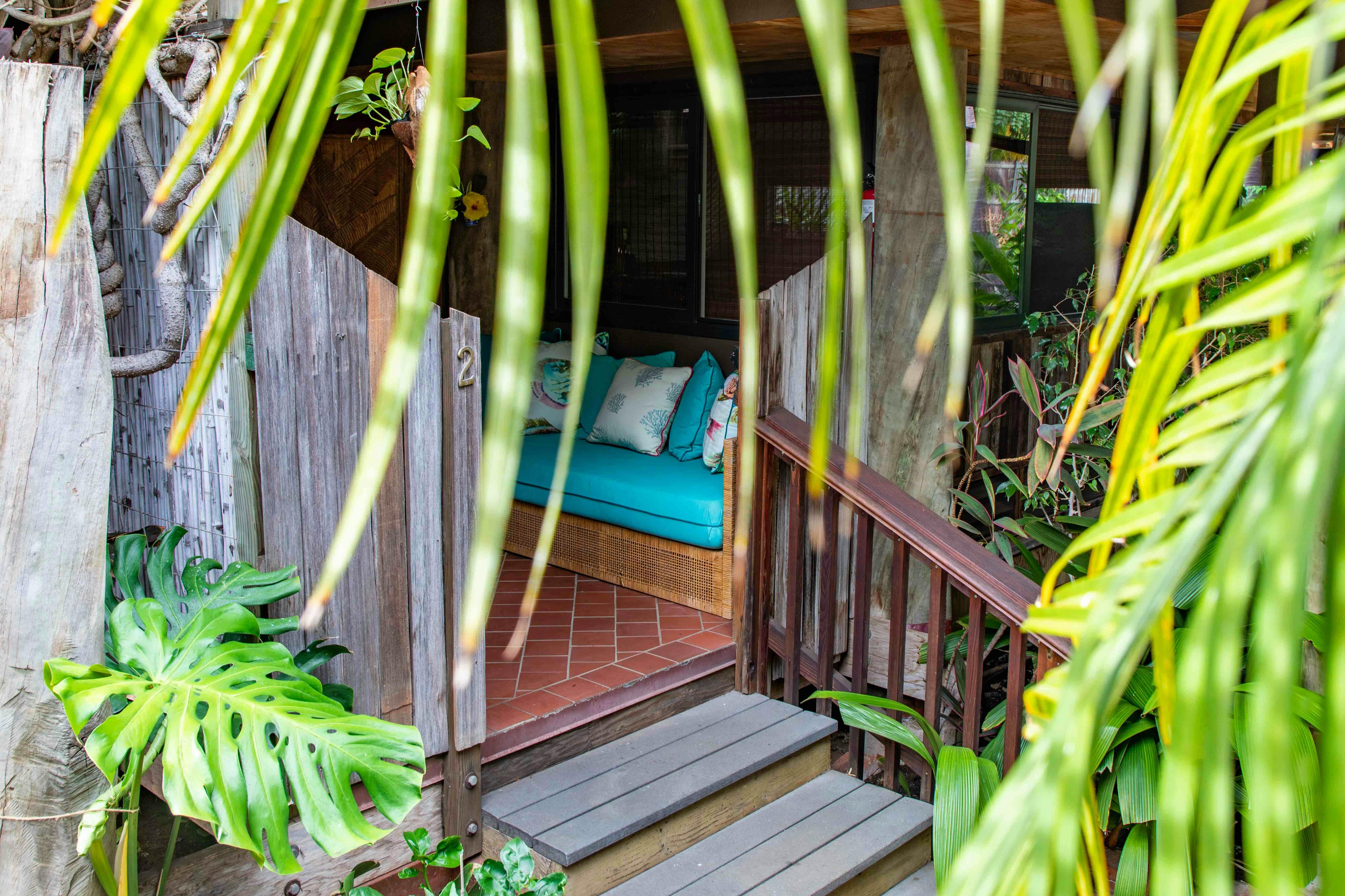 We've tried to incorporate as many natural materials in our bungalows as possible--tropical hardwood floors and carved doors, hand poured concrete counters, fresh foliage, etc. Our high barrel ceilings have louvered windows for natural ventilation, though bedrooms are equipped with A/C units. We've furnished the units with vintage Hawaiiana details, but we've kept things basic and hope you will enjoy a more simple way of living during your stay.