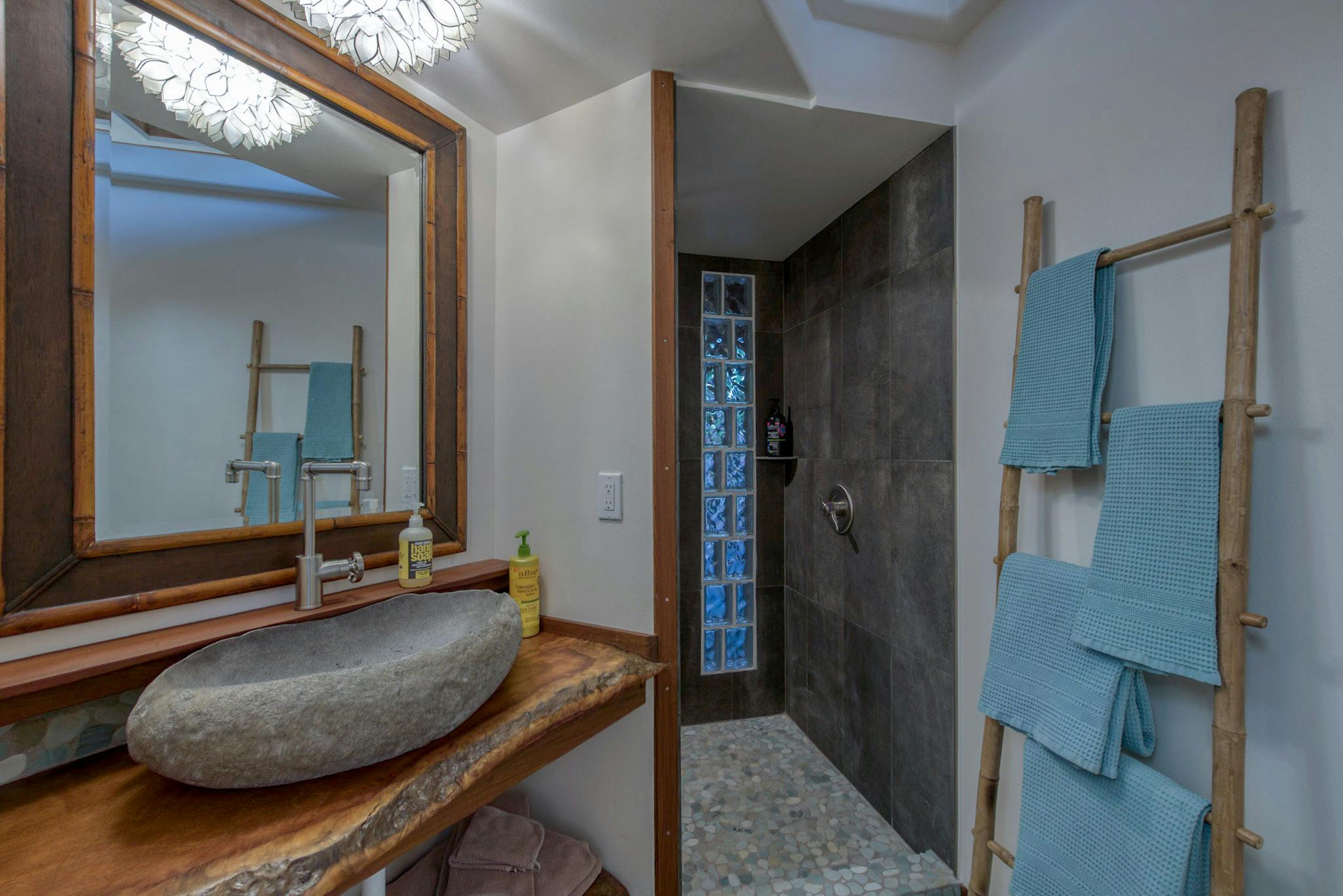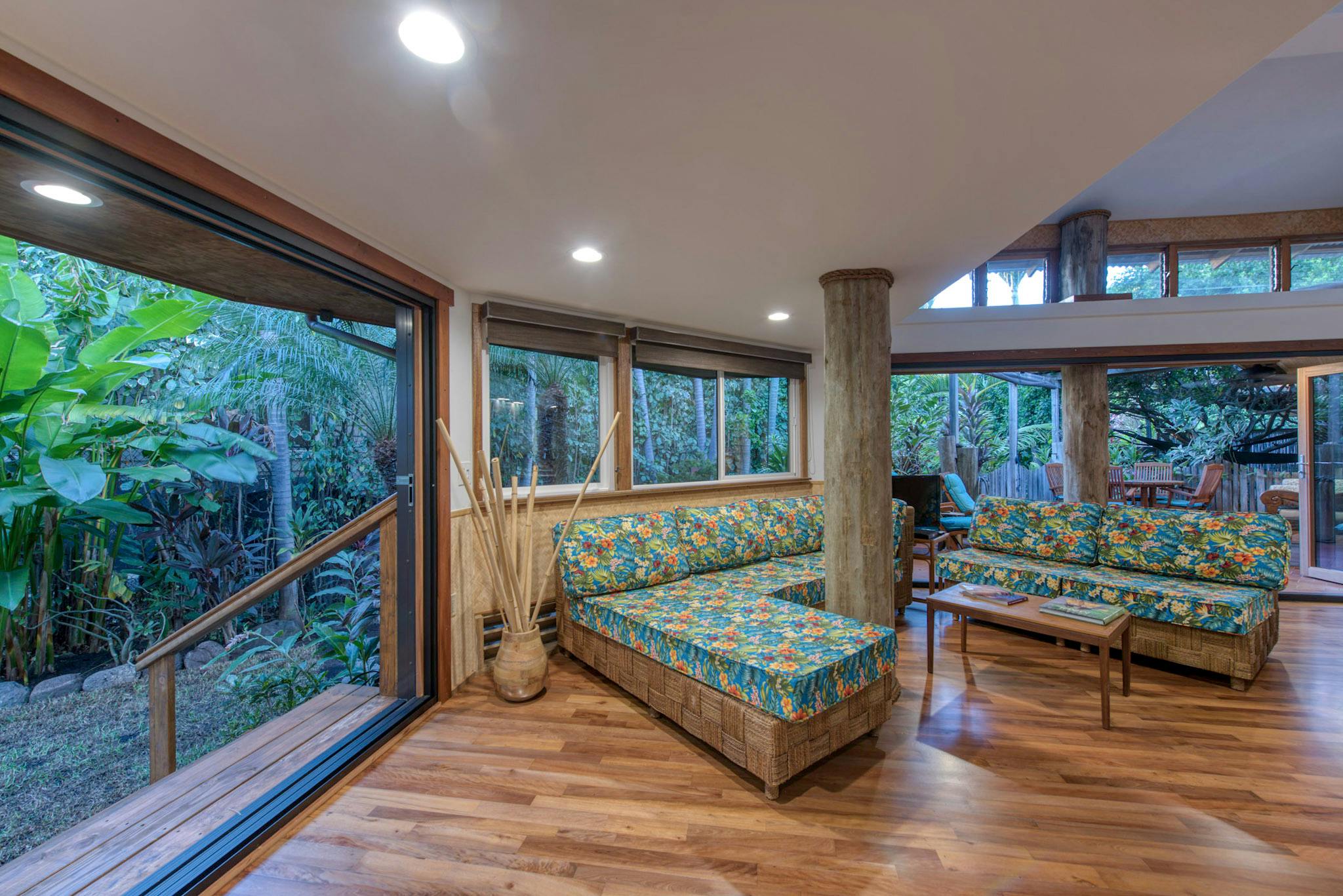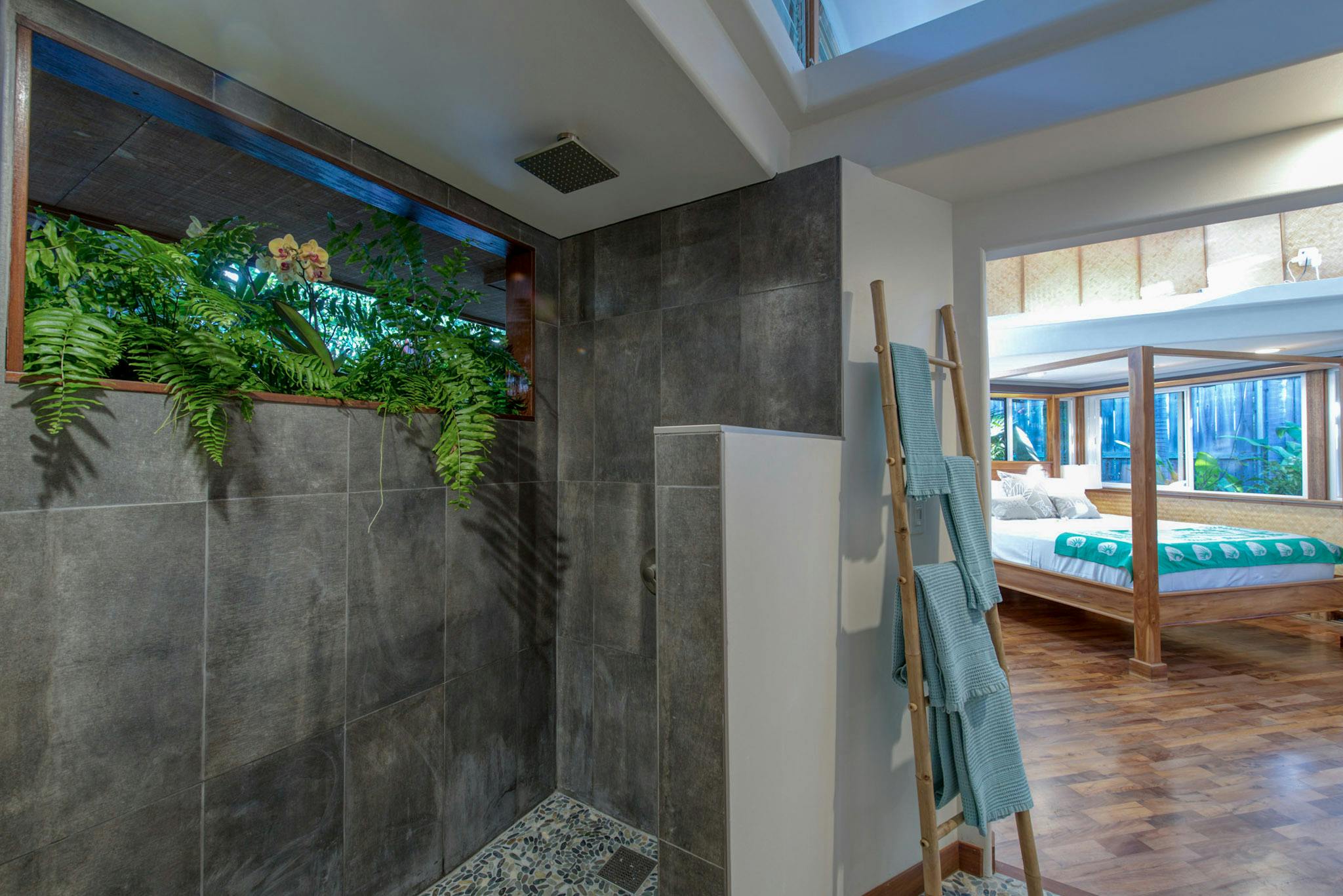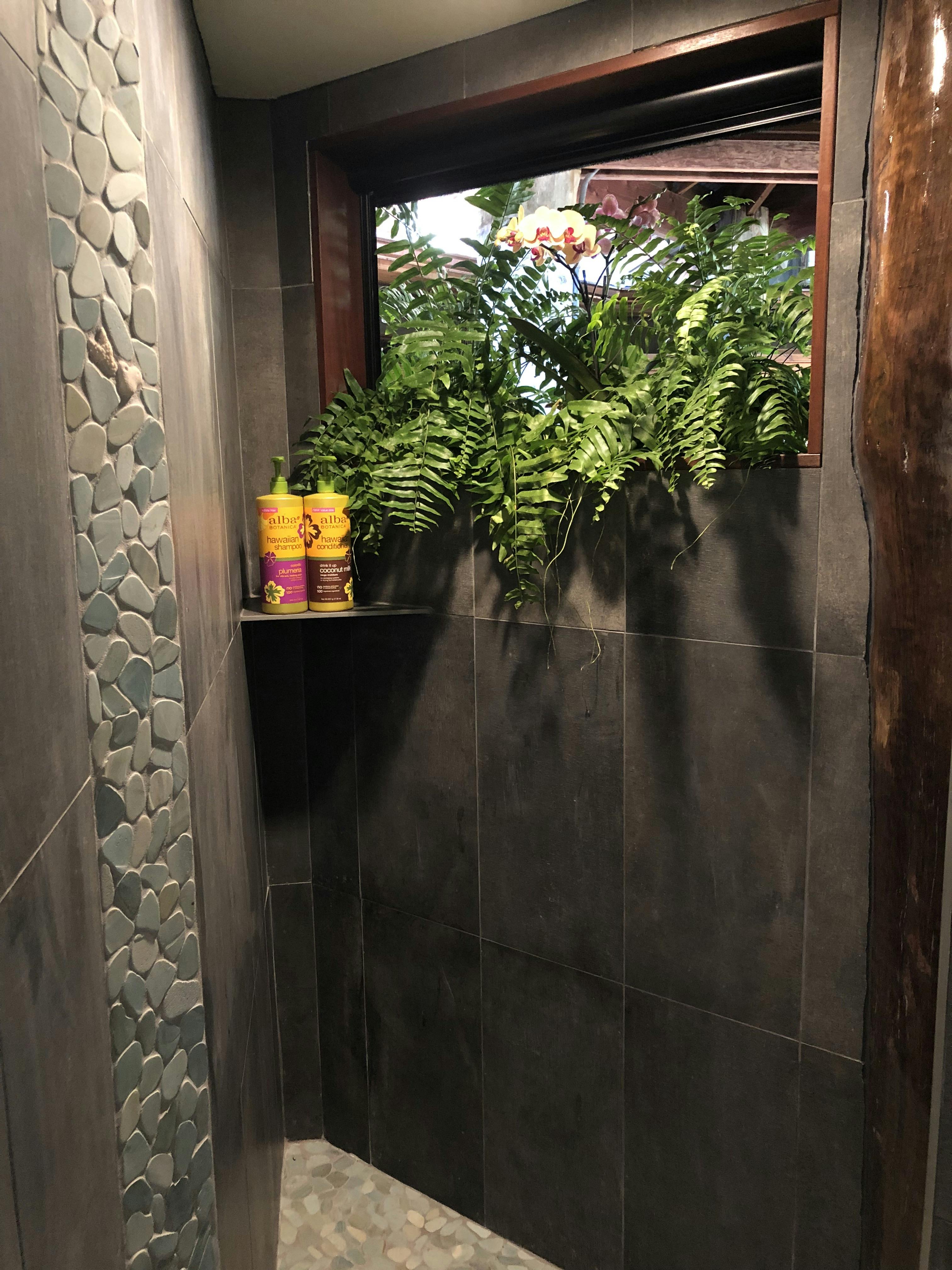 We've tried to incorporate as many natural materials in our bungalows as possible--tropical hardwood floors and carved doors, hand poured concrete counters, fresh foliage, etc. Our high barrel ceilings have louvered windows for natural ventilation, though bedrooms are equipped with A/C units. We've furnished the units with vintage Hawaiiana details, but we've kept things basic and hope you will enjoy a more simple way of living during your stay.
