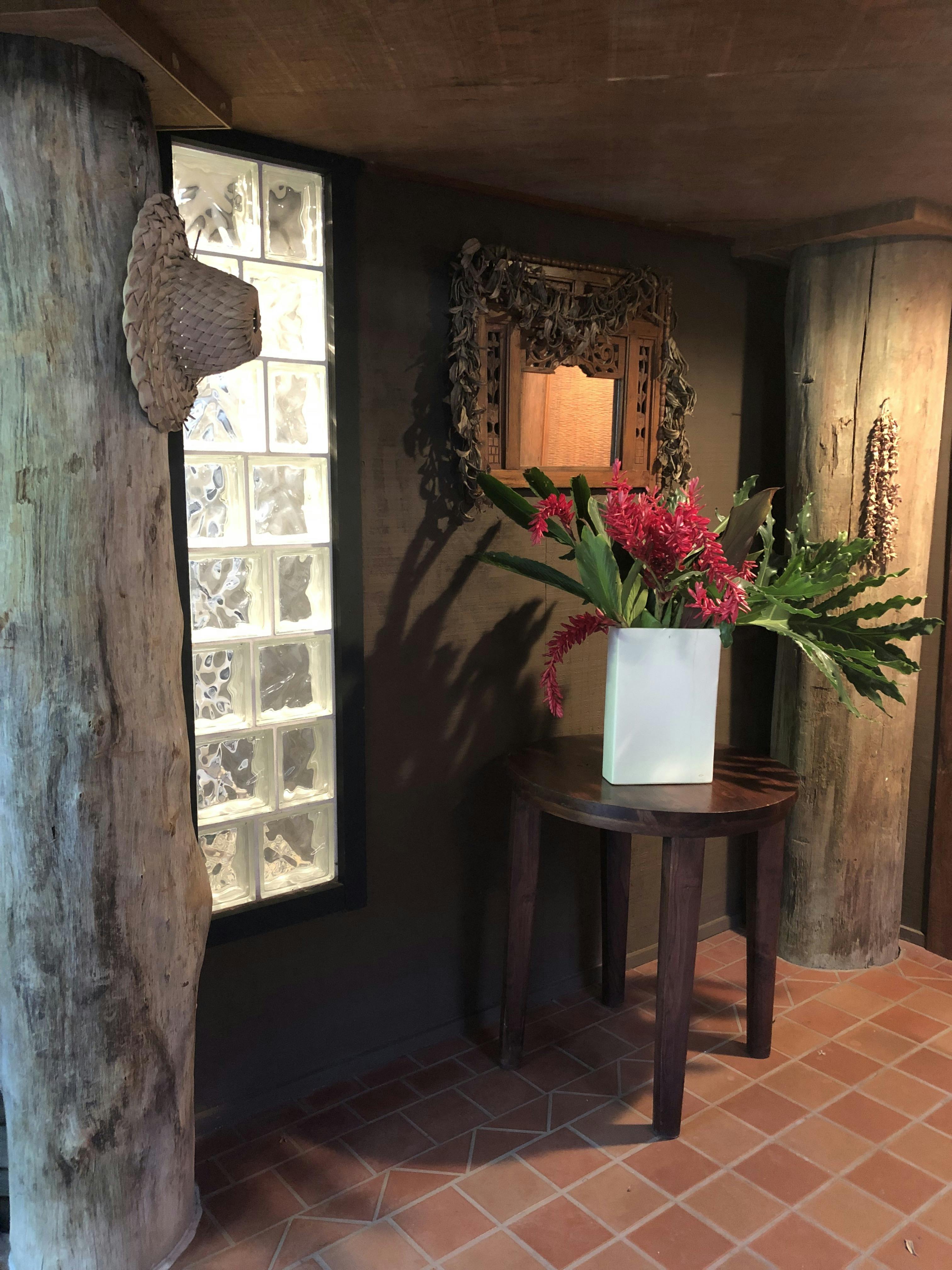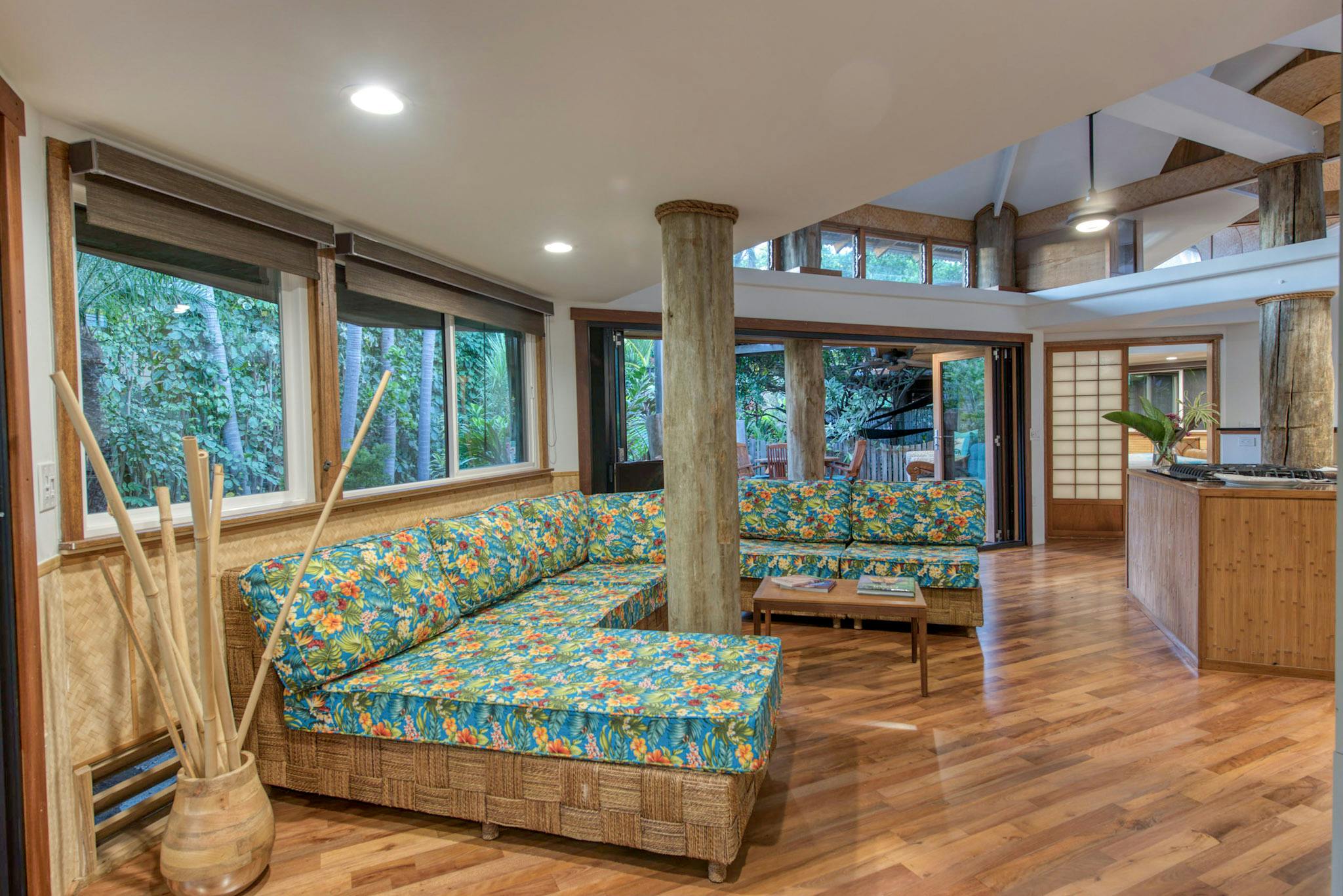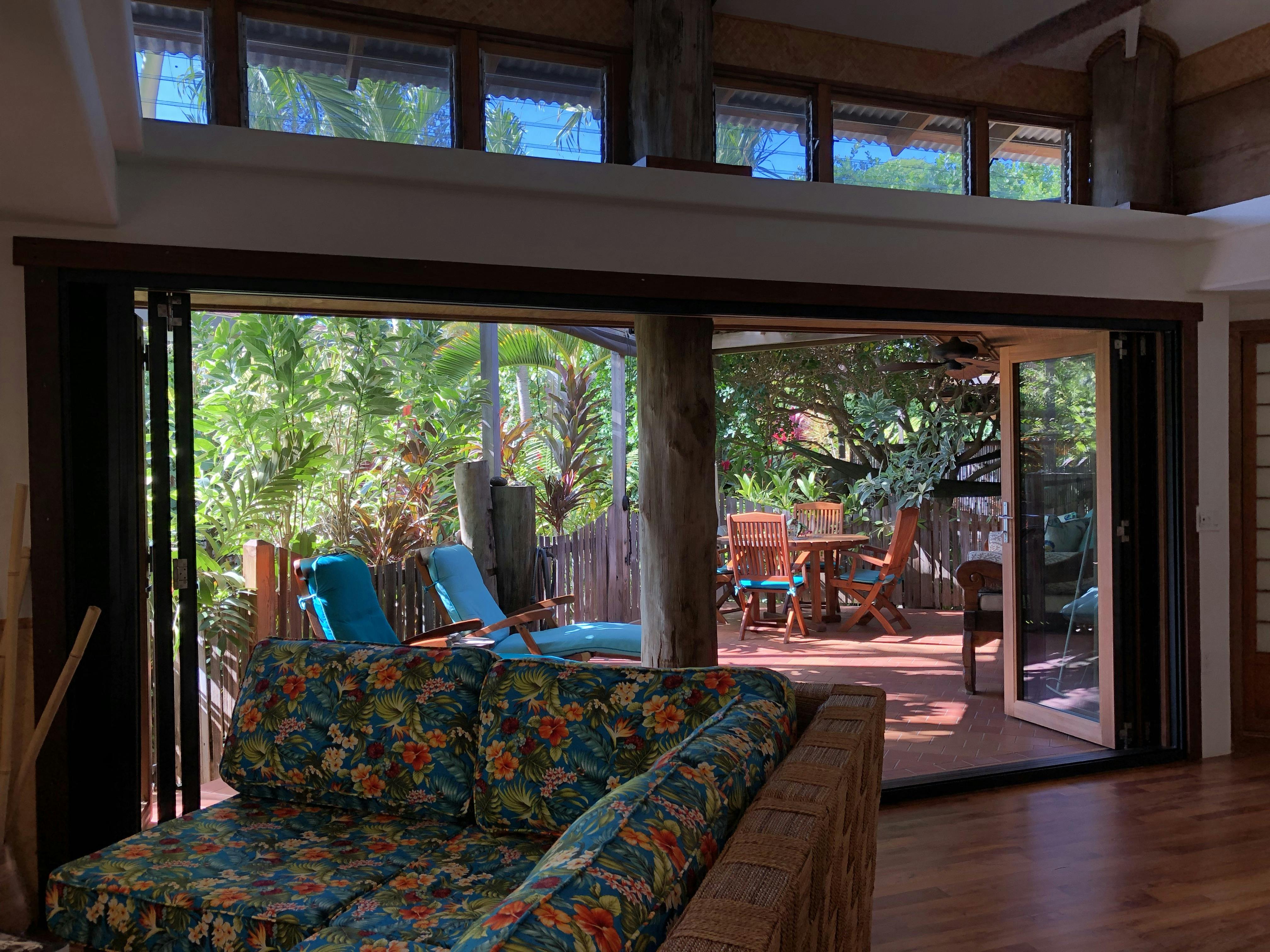 We've tried to incorporate as many natural materials in our bungalows as possible--tropical hardwood floors and carved doors, hand poured concrete counters, fresh foliage, etc. Our high barrel ceilings have louvered windows for natural ventilation, though bedrooms are equipped with A/C units. We've furnished the units with vintage Hawaiiana details, but we've kept things basic and hope you will enjoy a more simple way of living during your stay.