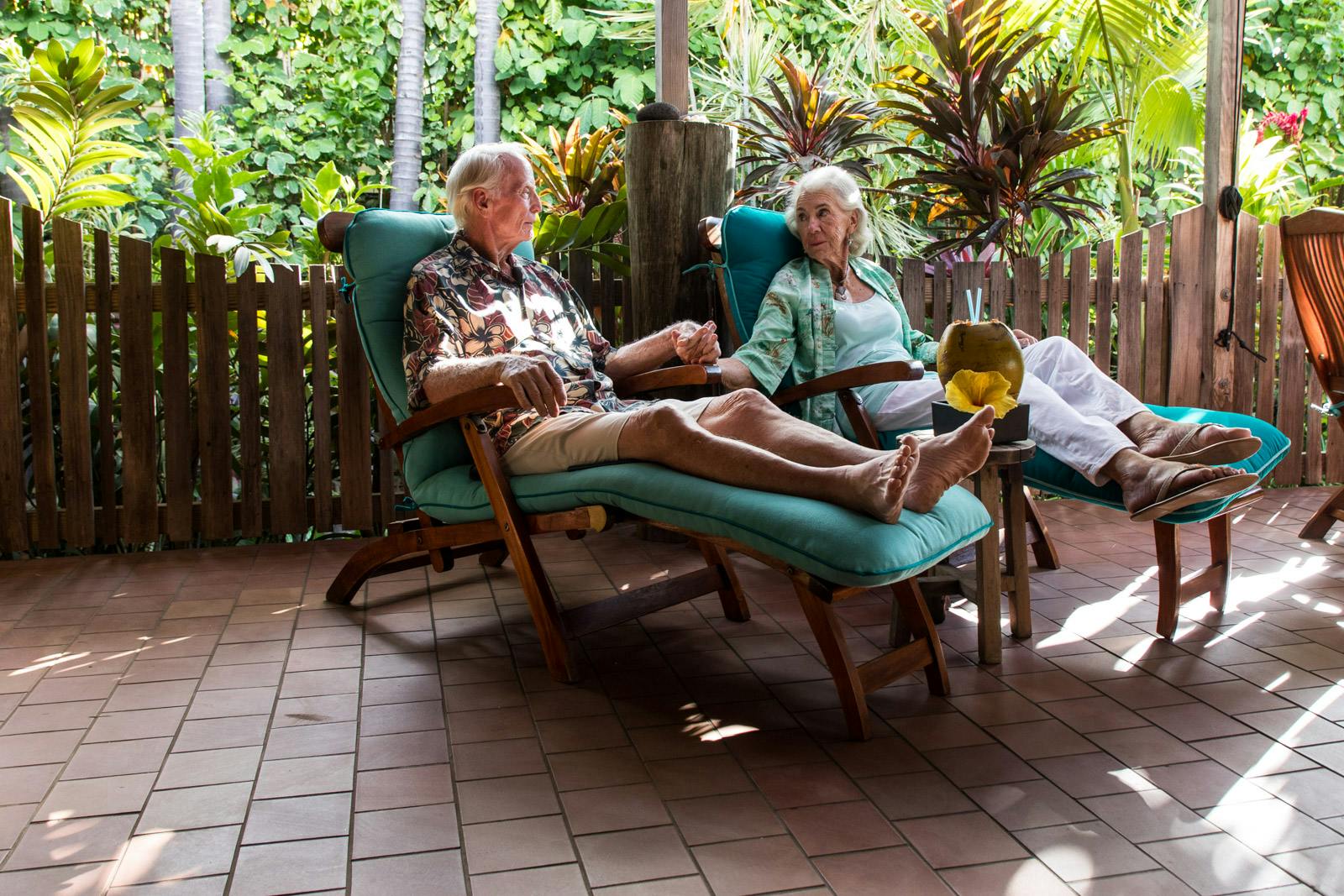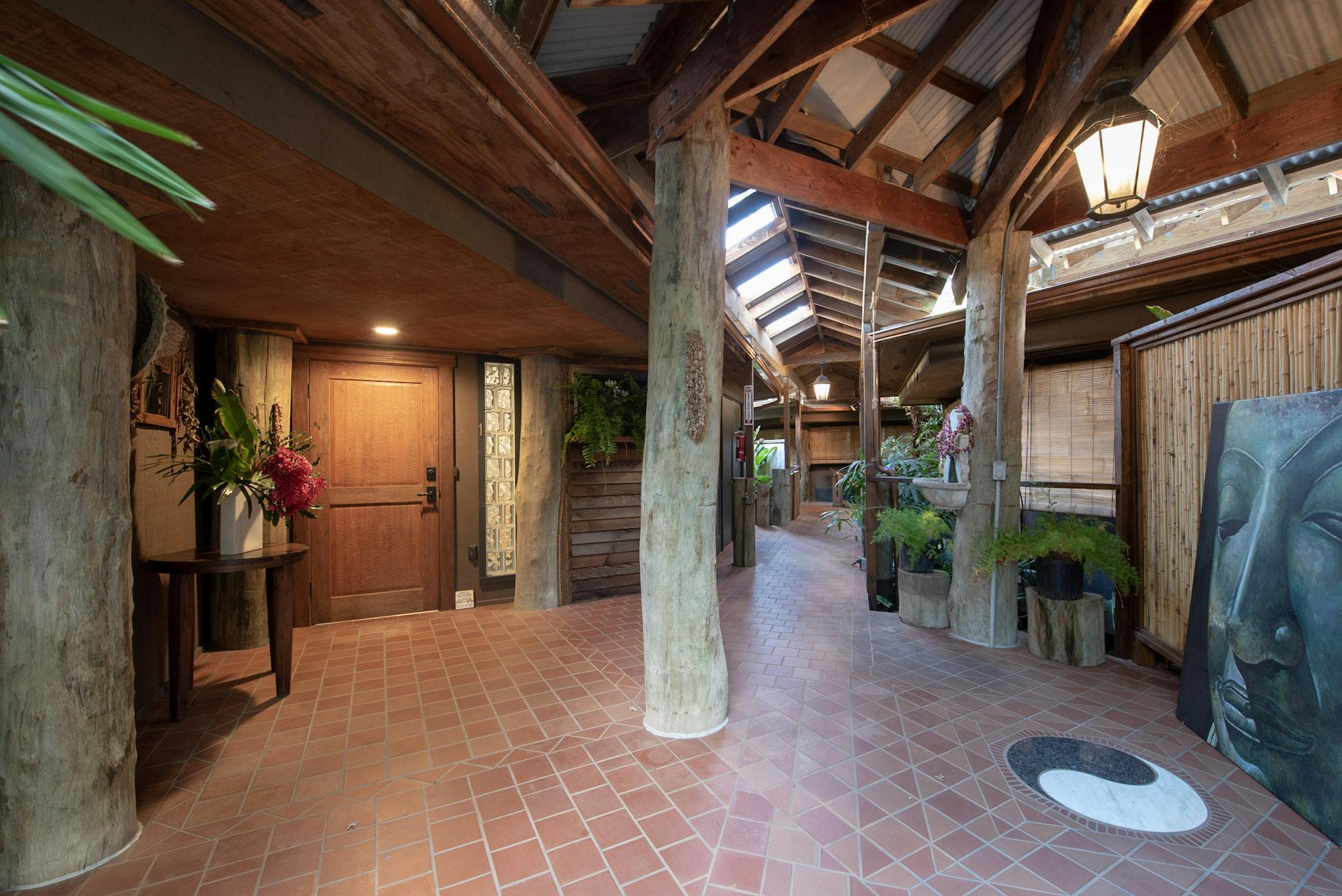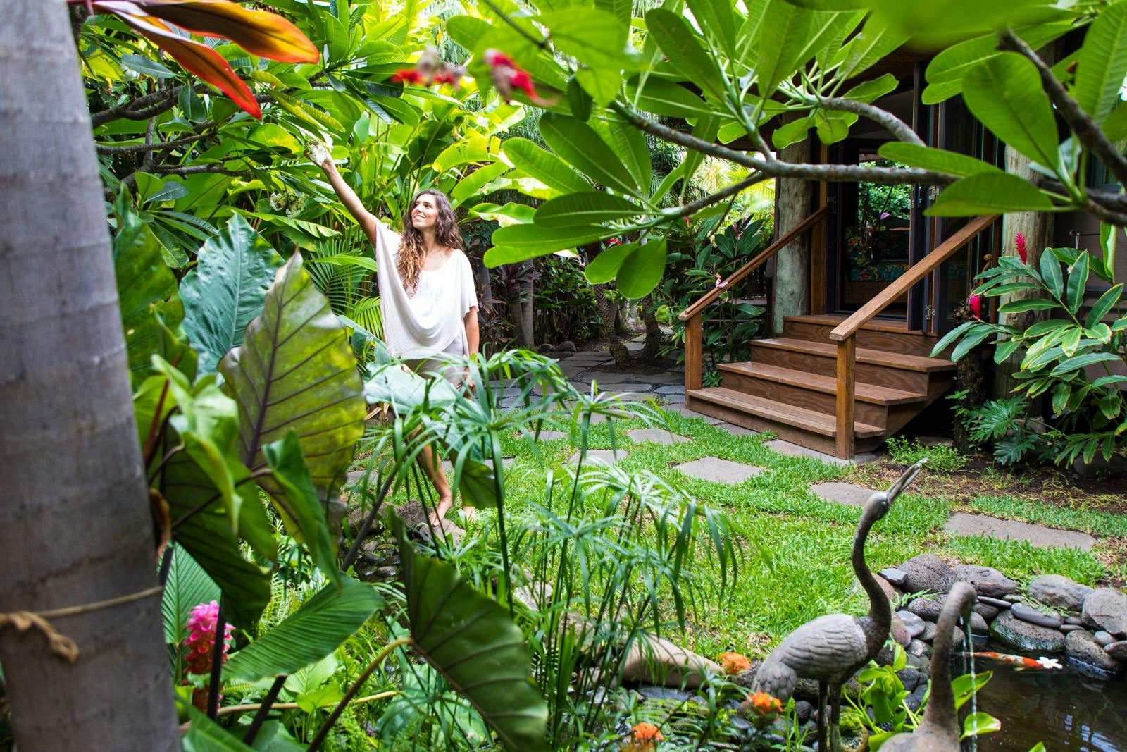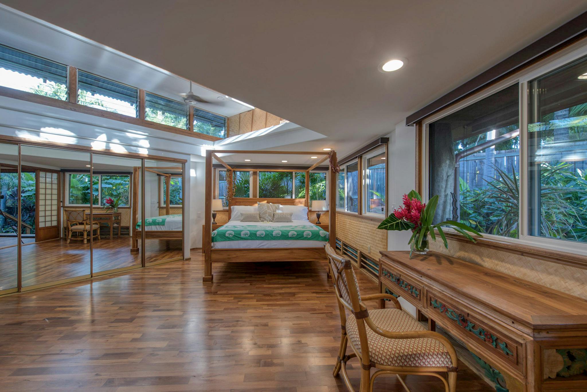We've tried to incorporate as many natural materials in our bungalows as possible--tropical hardwood floors and carved doors, hand poured concrete counters, fresh foliage, etc. Our high barrel ceilings have louvered windows for natural ventilation, though bedrooms are equipped with A/C units. We've furnished the units with vintage Hawaiiana details, but we've kept things basic and hope you will enjoy a more simple way of living during your stay.