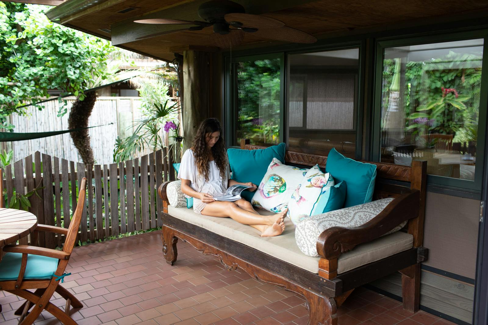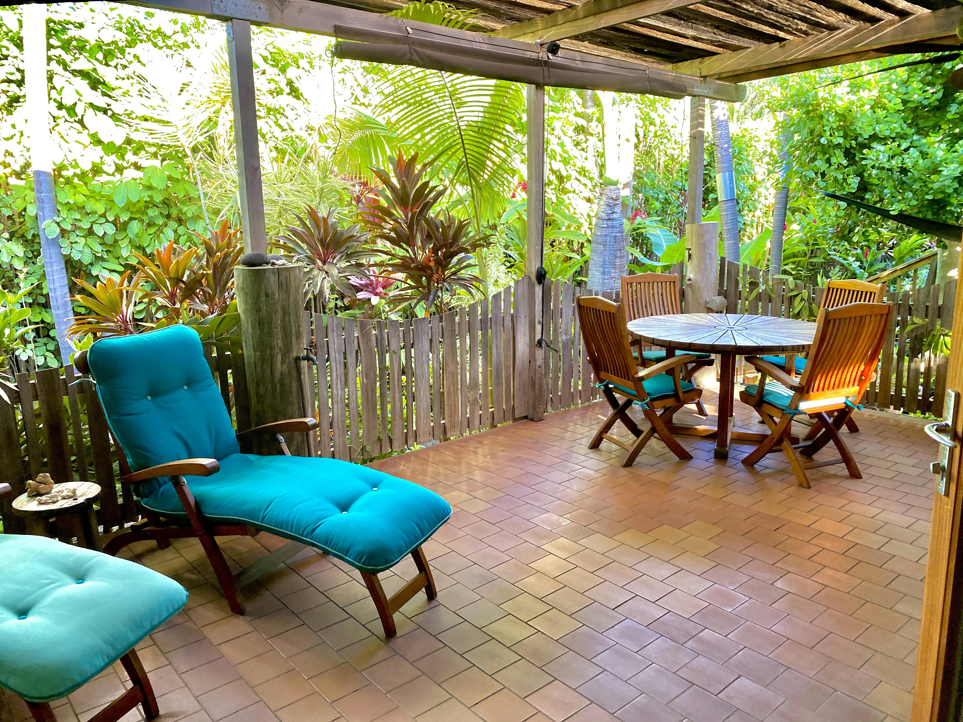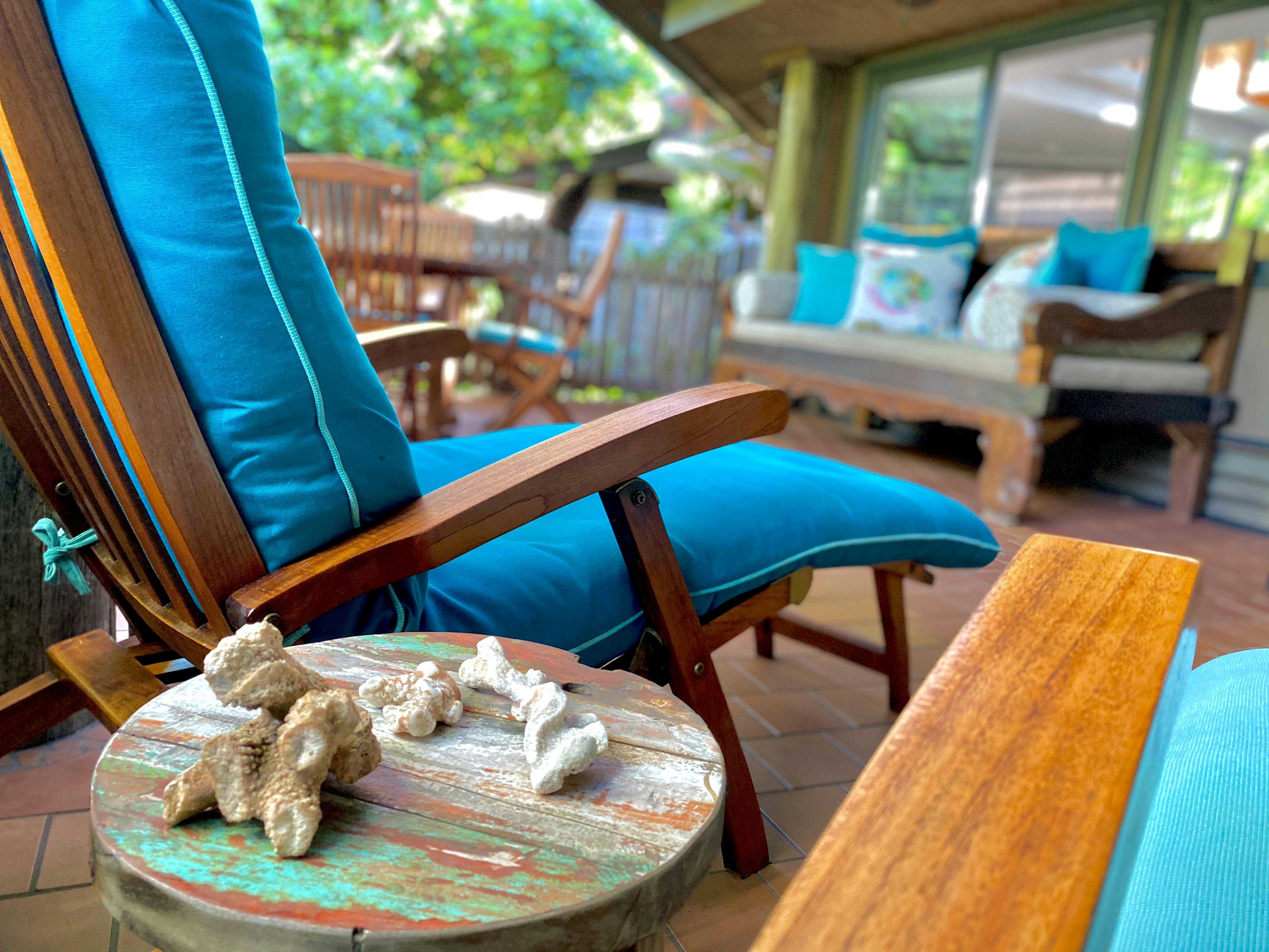 - private outdoor lanai with day-bed lounge, lounge chairs and dining table